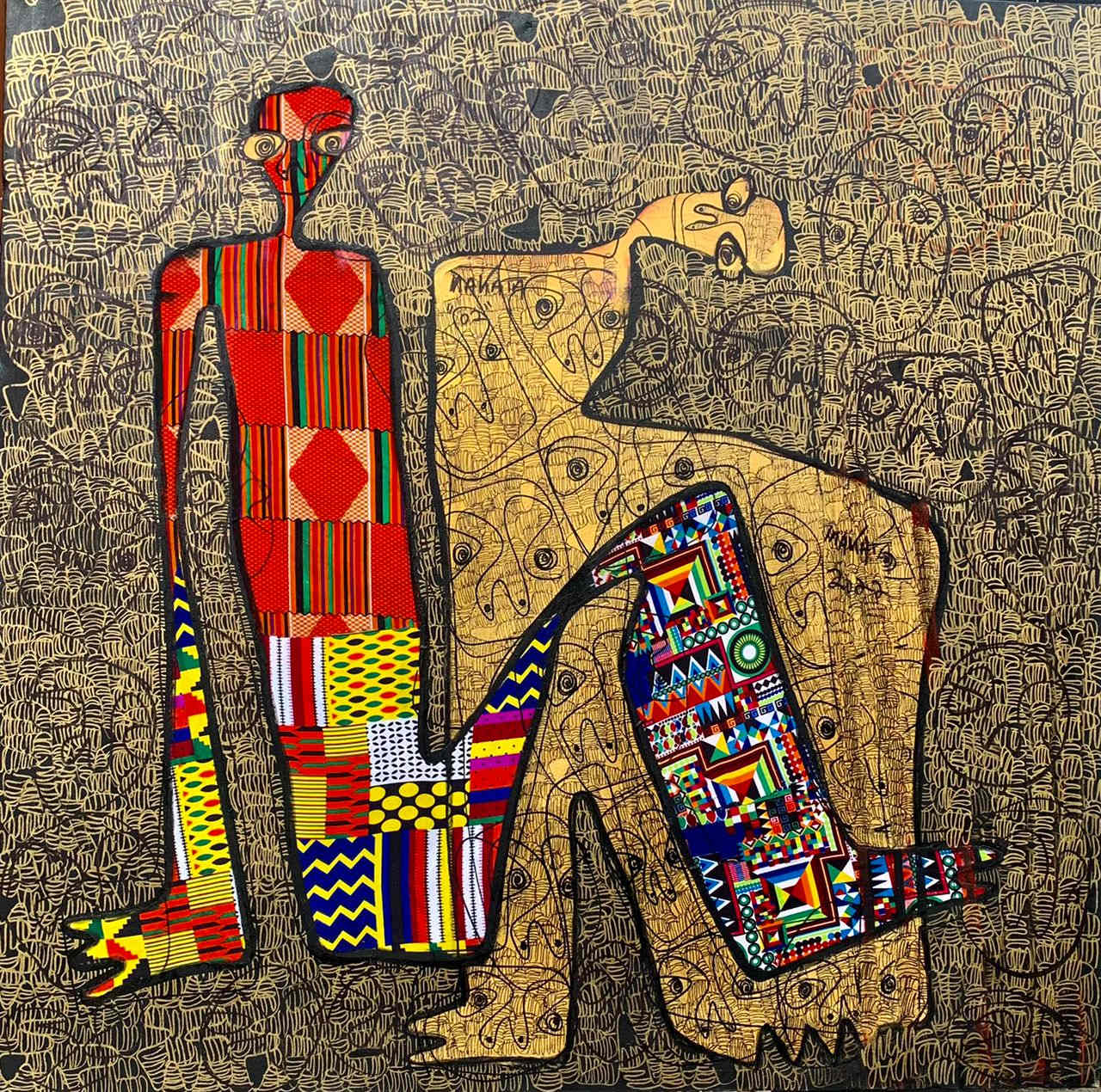 b. 1981, Enugu, Nigeria Lives and works in Lagos, Nigeria Obinna Makata is a Nigerian sculptor and mixed-media artist whose work interrogates cultural identity, consumerism, and rapidly shifting social values within contemporary Nigeria. A 2007 graduate of the University of Nigeria, Nsukka, with a degree in Sculpture, he creates visually vibrant collages using ink, acrylic, and scraps of Ankara fabric—materials he sourced from discarded textile scraps found at a tailor’s stall. He describes these compositions as “broken pieces of African culture,” responding to the encroachment of foreign influences and the fragmentation of traditional value systems. Makata’s visual language blends vivid strokes and textiles to evoke a mythic yet urgent narrative of collective identity and disruption. Over his career, he has completed artist residencies at the African Artists’ Foundation, Thought Pyramid Art Centre in Abuja, and the Matadero Museum in Madrid. His first solo exhibition, Metahistories, debuted at the African Artists’ Foundation in Lagos in 2012, and he has since participated in more than twenty-five group shows across Africa and beyond. In 2025, he presented Fabricated Identities, a significant solo exhibition at SOTO Gallery in Lagos, exploring the weight of consumer culture and material histories through intricate collage and his newly launched Carton Series.