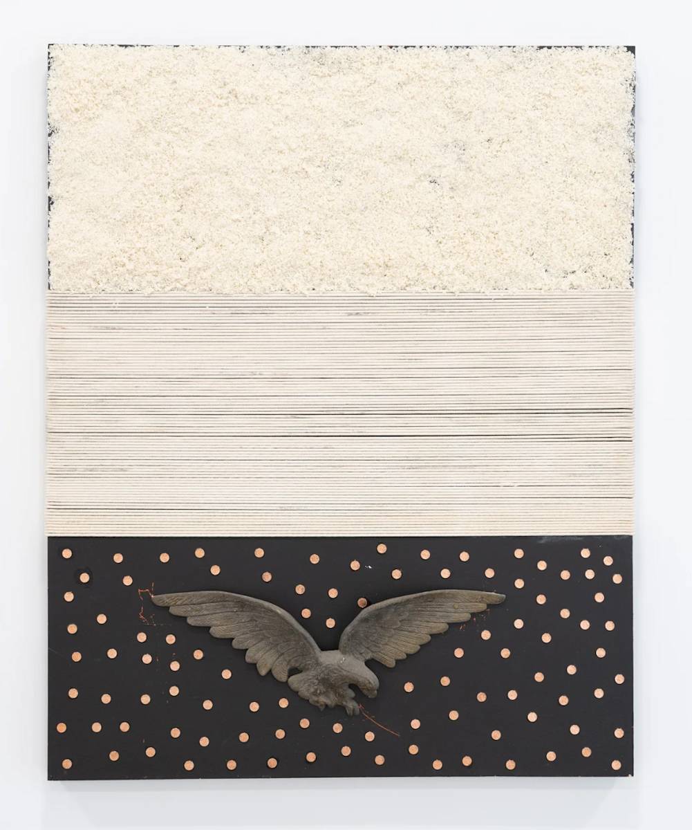 Rice, Rope, Pennies & Eagle Sculpture on Wood Canvas