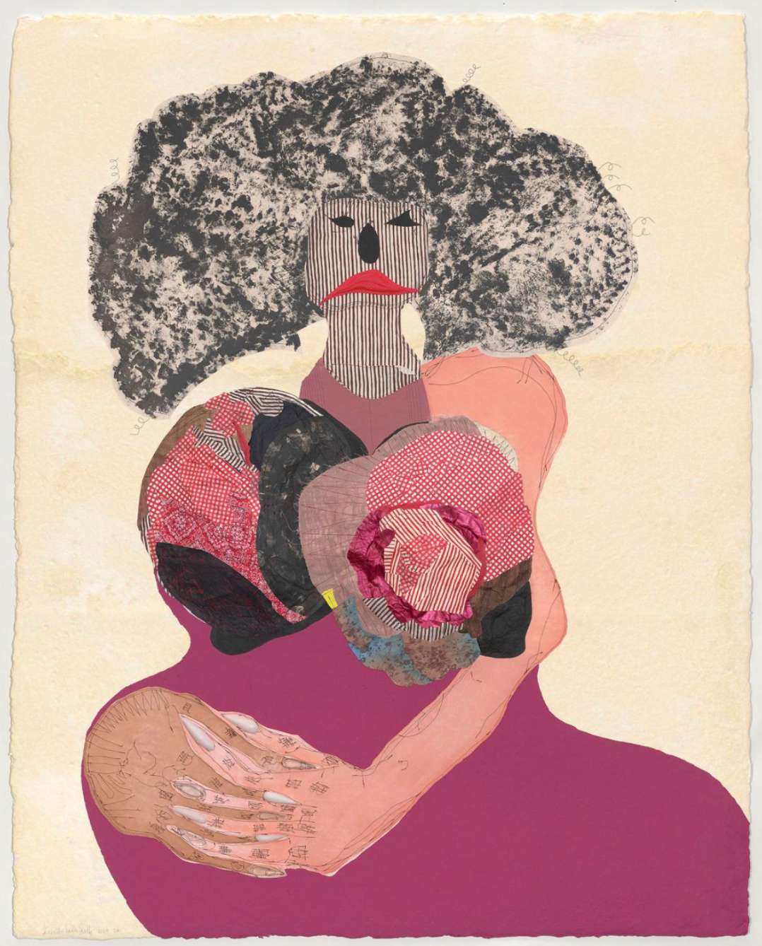 Collage with silkscreen, etching, cut paper, cast paper, cast resin, thread, and laser engraving on water colored, handmade paper